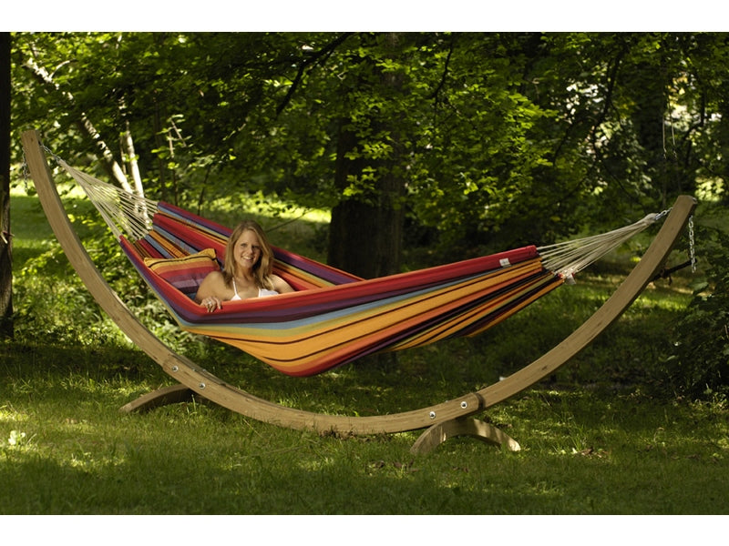 Mooie stevige staander in boogvorm. Geschikte hangmatten : Ecuador en Brasil Dubbel en Stokken Dubbel. In deze prijs is de hangmat NIET inbegrepen!